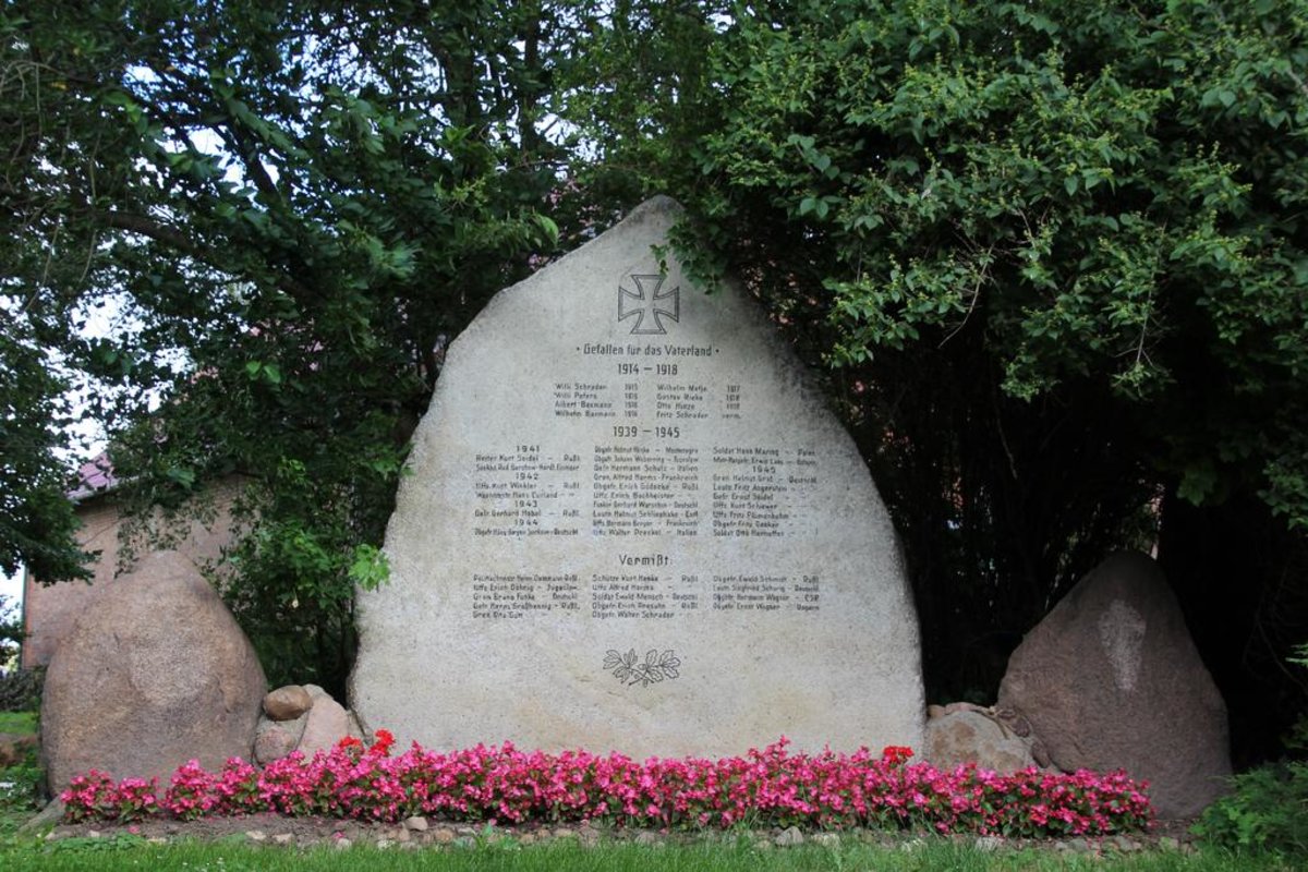 Vor der Kirche steht ein ca. 6000 kg schwerer, aus dem Harz stammender Felsen - ein Ehrenmal von 1954, das an die Vermissten und